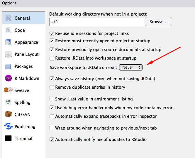 A consequence of this approach is that you should never save .RData when you quit R or load .RData when you start R.